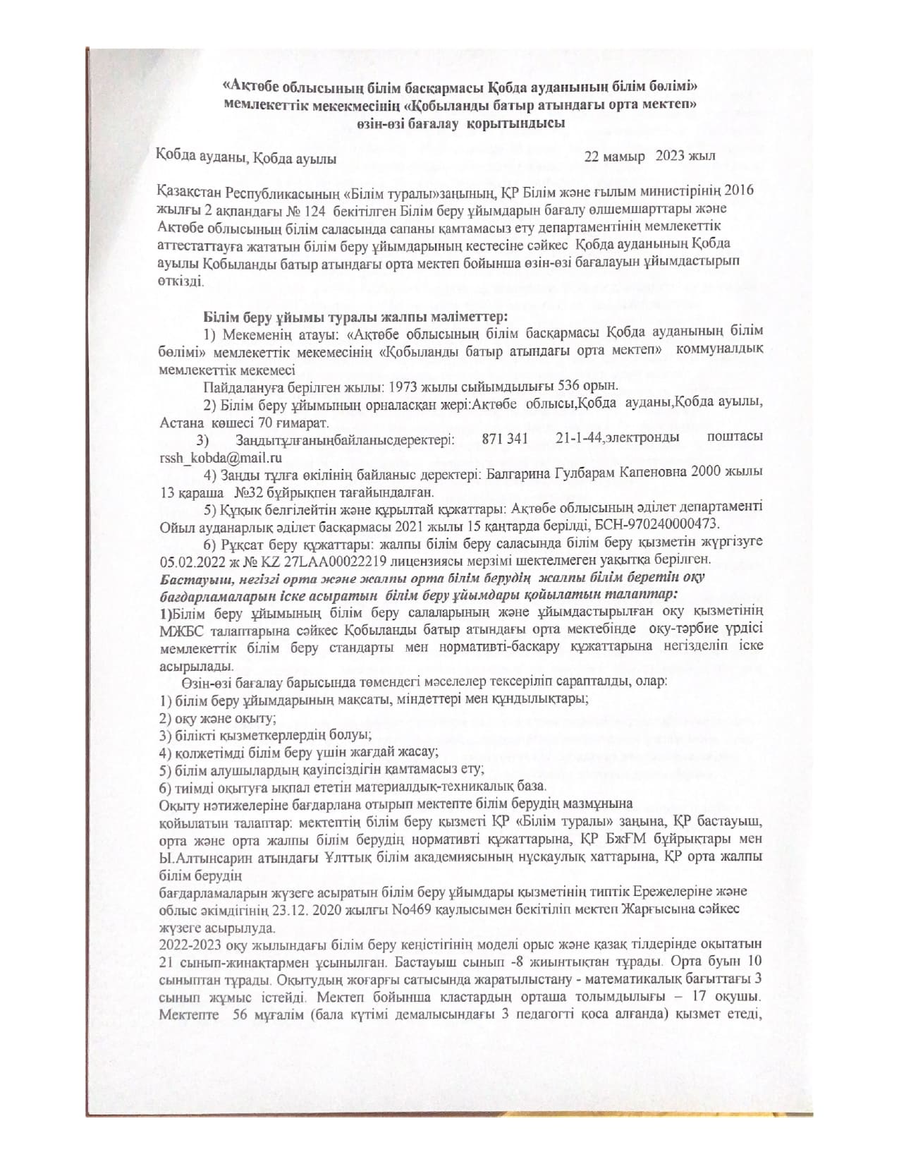 Толық көру үшін сілтемеге басыңыз: "Ақтөбе облысының білім басқармасы Қобда ауданының білім бөлімі" мемлекеттік мекемесінің Қобыланды батыр атындағы орта мектебінің өзін өзі бағалау қортындысы 2022-2023 оқу жылы