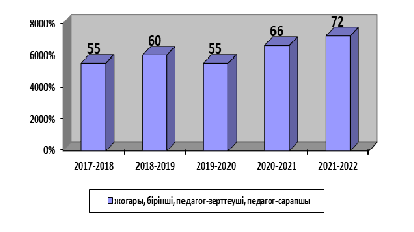 45 – 54 % жалпы білім беретін мектептер үшін, 45 – 54 % мектеп-гимназиялар, 45 – 54 % мектеп-лицейлер, 50 – 59 % лицейлер үшін, оның ішінде жаратылыстану-математикалық бағыты бойынша педагогтер үлесі 40 – 49 %, 50 – 59 % гимназиялар үшін, қоғамдық-гуманитарлық бағытындағы педагогтер үлесі 40 - 49 %, 55 – 64 % дарынды балаларға арналған мамандандырылған білім беру ұйымдары үшін, оның ішінде соңғы бес жылдағы білім беру саласындағы уәкілетті орган мен бекітілген конкурстар мен жарыстардың аудандық және/немесе облыстық кезеңдерінің жеңімпаздарын және/немесе Республикалық конкурстар мен жарыстардың қатысушылары мен жеңімпаздарын дайындаған педагогтер (болған жағдайда) |
